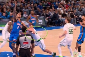 GIF-杰林威不沉球上篮2+1,凯尔特人挑战成功,杰林威先抓普理查德球衣,改为进攻犯规