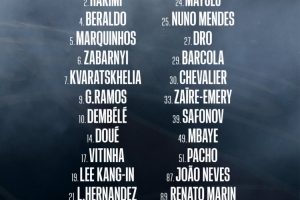 前锋:7-克瓦拉茨赫利亚、9-贡萨洛·拉莫斯、10-登贝莱、14-杜埃、29-巴尔科拉、49-姆巴耶
