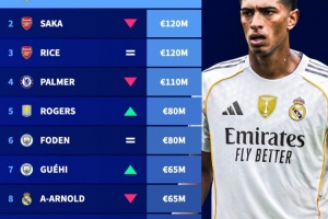 英格兰球员身价榜:贝林厄姆1.4亿欧居首,萨卡、赖斯均1.2亿欧