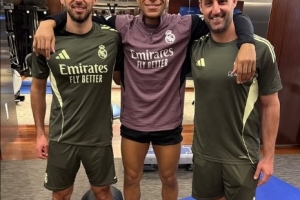 姆巴佩晒出了与皇马体能教练Sébastien Devillaz和理疗师Willy Zurdo的合照,配文写道:“一切全看努力。??”