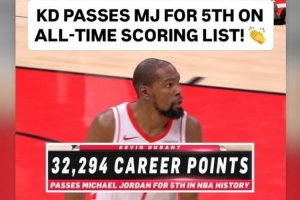 在本场比赛中,杜兰特生涯总得分32294分,超越乔丹,上升至历史第五。