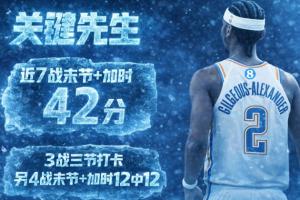 过去7战,亚历山大3次三节打卡,其余4场的末节和加时合计12中12,砍下42分。